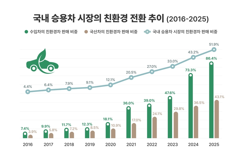 전체 승용차 판매량에서 친환경차가 차지하는 비중은 같은 기간 4.4%에서 51.9%로 상승했다. 친환경차에는 전기차, 하이브리드차, 수소차가 포함된다.