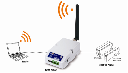SCM-WF48 시리즈는 USB 및 RS485신호를 와이파이 신호로 변환하여 디바이스와 PC 간 연결을 가능하게 하는 제품으로 최대 100미터까지 무선 통신이 가능하다.