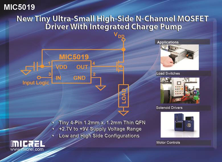 마이크렐은 하이-사이드 스위치 애플리케이션에서 N-채널 인핸스먼트-모드(Enhancement-Mode) MOSFET을 스위칭하도록 설계된 차지 펌프를 통합한 소형 하이-사이드 MOSFET 드라이버(MIC5019)를 출시했다. 이 디바이스는 부하 스위치 및 솔레노이드 드라이버, 모터 드라이버 애플리케이션에 이상적이다. MIC5019는 현재 양산제품이 공급되고 있으며, 가격은 1천개 기준 0.48달러이다.