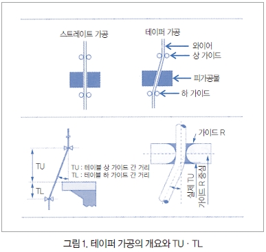 비약적인 정도 향상, 고부가가치를 실현해 온 와이어 방전가공기에 있어 테이퍼 가공은 없어서는 안 되는 존재이다. 프레스 금형의 다이 릴리프와 같이 1°로 안 되는 각도에서부터 공구 날붙이나 슬라이드 코어에서 볼 수 있는 10°를 넘는 것까지 폭넓게 사용되고 있다. 세밀한 곳에서는 0.001° 등의 미소 각도도 가능하며, 피가공물의 상하 치수 미조정에도 이용되고 있다.