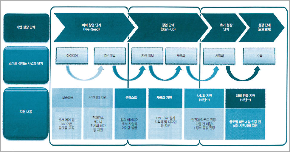 예비 창업 단계에서는 스마트 신제품 아이디어 발굴과 DIY 개발이 이루어진다. 이후 창업 단계에서 자금을 확보한 후, 제품 제작이 가시화된다. 이렇게 제작된 스마트 신제품은 성장 단계에서 사업화와 수출을 거치게 된다.