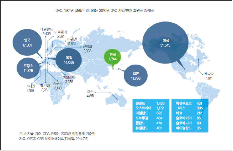 공적 개발 원조(Official Development Assi-stance, ODA)란 개발도상국의 경제 발전과 복지 증진을 위해 개발도상국 혹은 개발도상국 원조에 관여하는 국제기구에 공여하는 공적 자금을 말한다. 경제협력개발기구(OECD) 개발원조위원회(Development Assistance Commit-tee, DAC)의 원조국 리스트에 속해 있는 국가와 해당 국가를 주요 수혜 대상으로 하는 국제기구를 그 대상으로 한다. 2013년 기준 국가별 ODA 규모는 그림 1과 같다.