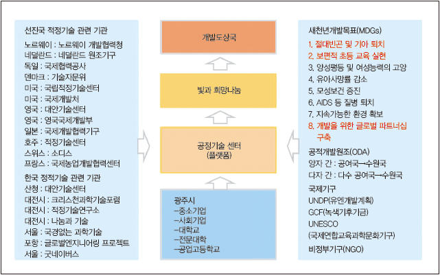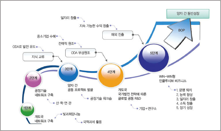 첫째, 공적 개발 협력을 통한 개도국 네트워크를 구축하는 것이다. 유네스코의 문맹 퇴치 사업 지원을 위한 교육 환경 개선 사업이 그 예라고 할 수 있다. 다음은 공정 기술 교육을 통한 산·학·연·관의 공정 기술 네트워크를 구축하는 것이다. 세 번째 단계는 양자 간의 공동 프로젝트를 발굴하는 것이다. 다음으로는 개도국 국가 발전 전략에 따른 공동 연구와 공동 개발 사업을 말할 수 있다. 마지막 단계는 개도국의 일자리 창출을 위한 윈-윈형 인클루시브 비즈니스를 창출하는 것이다.