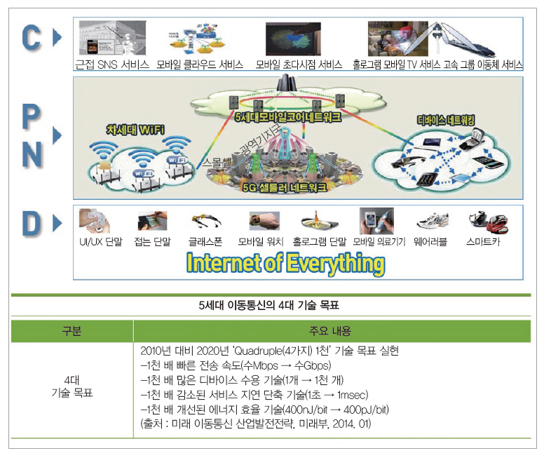 이러한 하이퍼 네트워크 사회에서는 사람이나 동식물 등 살아 있는 모든 것들의 움직임, 소리, 대화, 상태 정보 등이 1조 개가 넘는 IoT 디바이스들에 의해 수집되고 공유되어 사람과 자연을 위해 유익하게 쓰이고자 하므로, 이를 감당해야 하는 유무선 네트워크는 4G의 1천배 이상 되는 처리 성능이 필요하게 된다. 5G가 추구하고자 하는 기술개발 목표는, 이와 같이 1천 배로 성장하는 디바이스 폭증, 트래픽 폭증 시대에 대비하여 늘어나는 트래픽 부담을 원활히 감당할 수 있는 유무선 네트워크 기술을 적기에 개발하여 시장에 공급하고자 하는 것이다.