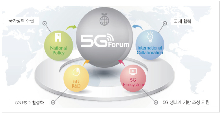또한, 민간차원의 5G 교류 모임인 5G 포럼 출범을 통해 자생적인 5G 생태시장 조성을 지원하고 있다. 이러한 정부의 선구적인 노력은 세계 각국이 벤치마킹하고 있으며 중국, 일본 등도 이와 유사한 IMT-2020 PG, 5G Promotion Group 등이 조직되었고, 유럽 연합은 메티스(Metis) 프로젝트 등을 통해 우리와 유사한 1천 배의 기술개발 목표를 세워 4G에 이어 5G에서도 기술 주도권을 이어가고자 노력하고 있다.[13]