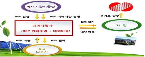 지난해부터 에너지신산업으로 본격 추진한 태양광 대여사업은 그간 정부의 보조사업 위주로 추진해온 태양광 설비 보급을 발상의 전환을 통해 별도의 예산 없이도 신재생에너지 보급 확대가 가능하도록 한 시장기반의 비즈니스 모델이다. 지난해 한 가구당 평균 전기료 절감효과로 연간 약 11만원 수준을 달성했다.