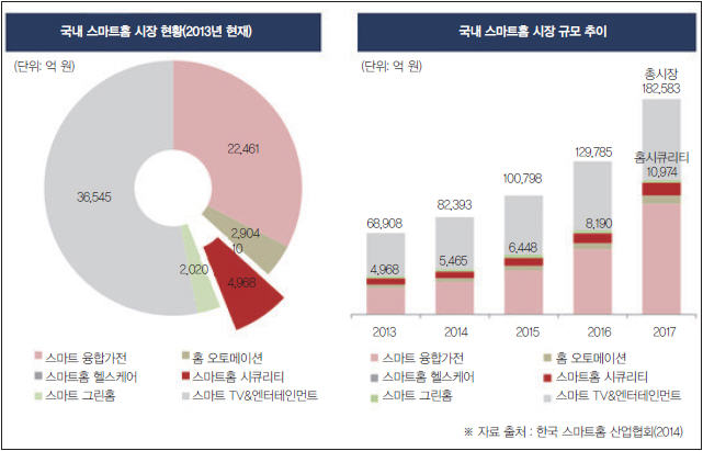 이 중 국내 스마트 홈 시장 내 홈 시큐리티(Home Security)는 약 5천억원 규모로 오는 2017년까지 1조 1천억원 규모로 성장할 것으로 전망된다(그림 4).