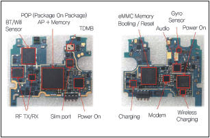 휴대전화 메인 보드는 그림 1와 같이 구성된다. Wifi 센서, AP, 메모리, 모뎀 등 다양한 부품이 탑재되며, 휴대전화의 다기능화에 따라 IC 계열의 부품이 점차 증가하고 있다.