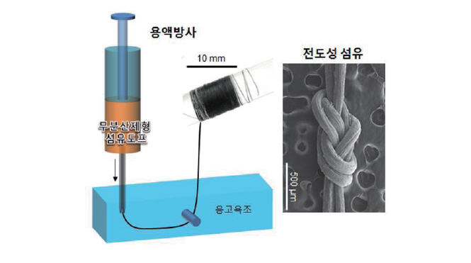 차세대 유연전극 재료로 각광받고 있는 탄소나노튜브(CNT)와 금속나노소재(은나노와이어)를 분산제 없이 복합화해 고전도성 섬유를 제조할 수 있는 기술이 국내 연구진에 의해 개발됐다. 미래창조과학부 국가과학기술연구회 산하 정부출연연구기관인 한국전기연구원 이건웅·한중탁 박사팀은 최근 의류 형태의 웨어러블 디바이스에 필수적인 ‘유연 고전도성 섬유’를 제조할 수 있는 고전도성 페이스트(섬유방사도프) 제조 기술 및 탄소나노튜브와 은나노와이어의 재배열을 통해 전기전도도를 획기적으로 향상시킬 수 있는 기술을 개발하는 데 성공했다고 밝혔다.