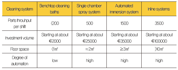 여기서 어셈블리 산출량을 고려해 세척 시스템을 선택하는 것은 세척된 부품당 최저비용을 실현하기 위해 중요하다. 그러나 이미 앞에서 언급한 바와 같이, 비용 최적화 과정이 완전히 자동으로 보장되는 것은 아니며, 비용요소는 각각의 세척 어플리케이션마다 다르기 때문에 모든 공정의 상세한 고려가 요구된다.