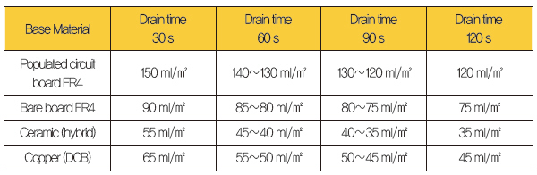 PCB에 액이 묻어 나가는 것은 기판 재질과 drain 시간에 따라 다르다. 세척될 기판 구조는 액 손실량에 직접적인 영향을 미친다. 어셈블리의 구조를 바꿀 수는 없기 때문에 drain 시간 늘려 액 손실량을 줄이고, 지그(bas-ket) 고안을 통해 PCB에 묻어있는 액을 다시 세척조로 떨어뜨리도록 해야 한다.