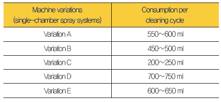세척액 관점에서, 어플리케이션 농도와 세척액 수명은 가장 중요한 비용요소이다. 하지만 세척액 교환 주기, 즉 세척액 수명 그 자체는 단일챔버 시스템에서 세척액 전체 교환 시 발생하는 비용과는 크게 연관성이 없다.