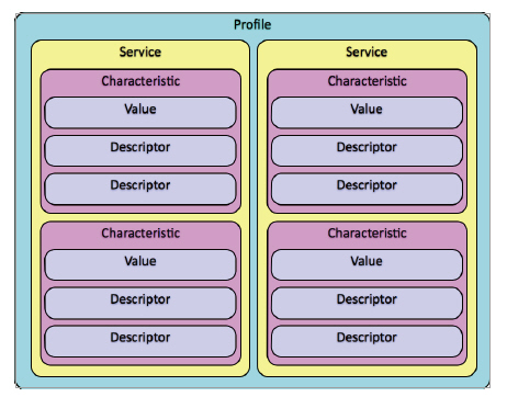 따라서 GATT를 이용하여 장치의 세부 속성을 정의하고 통신에 사용하게 된다. 그림 1은 하나의 GATT(Generic Attribue)프로파일에 포함되어 있는 세부 속성 및 내용을 보여주는 그림이다.