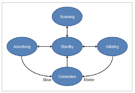BLE 장치는 매우 단순한 상태 구조를 가지고 있다. 그림 2는 BLE 장치의 상태 변이 과정을 보여준다.
