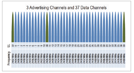 그림 3은 BLE에서 사용하는 통신 채널 및 주파수의 할당 상태를 보여준다. BLE의 경우 총 37개의 데이터 통신을 위한 주파수와 3개의 광고 채널을 통해 운영이 된다.