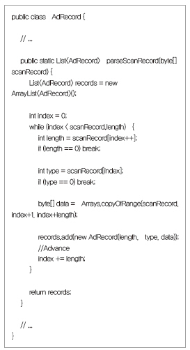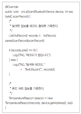 다음 소스는 센서태그와 연결을 위해 사용하는 OnLeScan이라는 메소드의 소스다. BLE 장치를 검색하고 검색된 정보를 adRecord라는 매소드를 통해 List에 저장하게 된다. 저장된 정보는 연결을 위해 사용하게 된다.