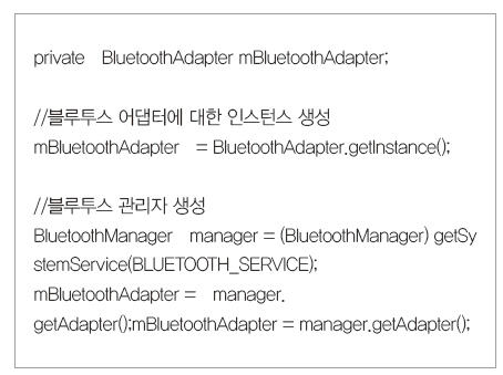 우선 지난호에 설명한 것처럼 블루투스 장치에 대한 초기화 작업을 프로그램 초기에 시작하게 된다. 안드로이드 불루투스 통신을 위해서는 먼저 장치에 대한 탐색이 이루어지고 연결을 통해 통신이 이루어 저야 한다. 안드로이드 4.3 버전 이전에는 BluetoothAdapter.getInstance() 매소드에 의해 바로 접근이 가능했지만 현재는 BluetoothManager를 통해서 접근해야 한다는 차이점이 있다.