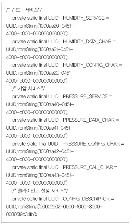 센서태그 장치에는 여러 센서들이 있고 이 센서들을 접근하기 위해서는 앞에서 설명한 것처럼 GATT에 의해 접근을 해야 한다. 각 장치에 대한 정보는 UUID 형태로 정의되어 있으며 자세한 내용은 리스트 2와 같다.