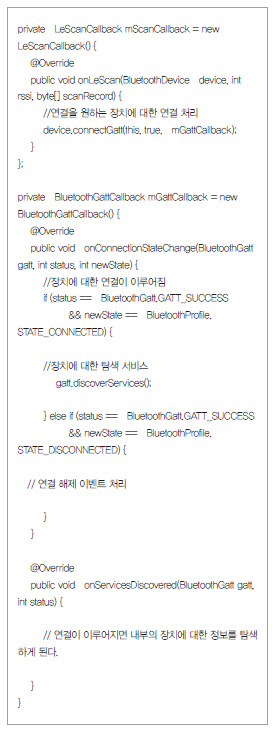 다음은 안드로이드 앱에서 센서태그 장치를 검색하여 연결하는 것이다. 센서태그에 대한 장치에 대한 검색이 마무리되면 콜백 형태로 연결 처리를 하게 되며, 센서태그 내부에 있는 센서에 대한 세부 GATT 정보를 읽어 들여 통신을 하게 된다.