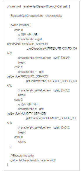 센서태그에 내장된 센서를 이용하기 위해서는 각 센서에 대한 활성화를 시켜야 한다. 다 소스는 GATT내부에 정의된 정보에 따라 센서를 활성화 시키는 역할을 하다. 각 센서는 현재 센서의 값과 센서를 설정할 수 있는 설정 값을 가지고 있다. 센서는 기본적으로 꺼진 상태로 구성되어 있으며 아래 소스에 의에 동작하도록 구성할 수 있다. 이렇게 구성하는 이유는 전원 절약을 위해 센서는 끄고/켜는 작업을 자유롭게 하기 위해서다.