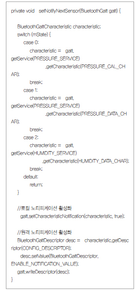 노티피케이션에 대한 처리는 두 단계로 이루어진다. 첫번째는 안드로이드 API를 사용하여 앱에서 장치에서 전달받은 노티피케이션 정보를 받을 수 있는 상태로 만드는 것이고, 두번째는 센서태그 장치에서 노티피케이션을 통해 센서 정보를 주기적으로 전달하도록 설정하는 것이다. 원격 노티피케이션 활성화를 통해 센서테크 장치에서 노티피케이션을 처리하도록 구성하는 것이다.