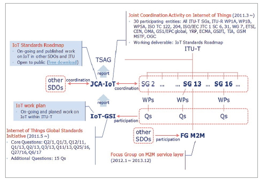 한편, ITU-T 내에서 대표적으로 사물인터넷 표준화를 담당하고 있는 스터디 그룹으로는 SG11, SG13, SG16, SG17을 꼽을 수 있다. SG11은 통신 프로토콜 및 API, 상호운용성 표준 개발을 전담하는 그룹이고, SG13은 통신망 요구사항 및 기능 구조 표준화를 전담하고 있으며, SG16은 멀티미디어 응용 서비스 및 코덱 표준화를, SG17은 각종 보안 이슈 표준화를 전담하고 있다.