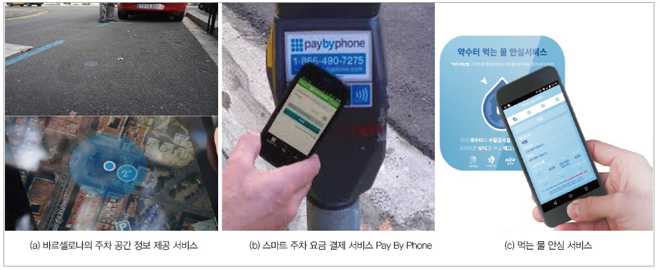 그림 2. 바르셀로나의 주차 공간 정보 제공 서비스와 스마트 주차 요금 결제 서비스인 Pay By Phone 및 먹는 물 안심 서비스
