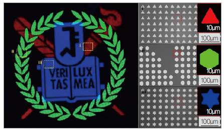 그림 1. 고해상도 음각 전사-인쇄 기술을 이용한 삼원색(적색, 녹색, 청색) 양자점 나노입자의 계층적 패턴 전사