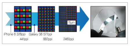 이 기술이 상용화되면 영화에서나 봐왔던 ‘사람 손목 피부 위의 디스플레이’가 현실화되는 것이다. 해상도 역시 세계 최고 수준인 2,460ppi로 유기 발광 다이오드(OLED)나 액정 화면(LCD)을 사용하는 최신 스마트폰의 4~7배, 고해상도 티브이(HD TV)의 42배나 된다.
