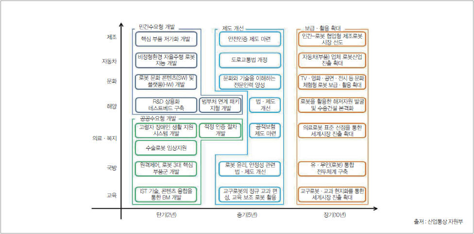 이에 맞춰 우리나라 정부의 로봇산업 육성 정책에도 변화가 나타나고 있다. 1978년, 자동차 용접 로봇이 국내 최초로 도입됐을 당시에는 로봇산업에 대한 정부지원이 없는 상태에서 산·학 자체적으로 로봇에 관한 R&D가 진행됐다. 1990년대에는 자동차·반도체산업이 성장하고 자동화에 관한 요구가 증가하면서 로봇산업이 규모화되기 시작했다. 2000년대 들어 IT산업의 급신장에 따라 정부 지원이 체계화돼 여러 부처가 로봇 활용 R&D를 지원하기 시작했다.