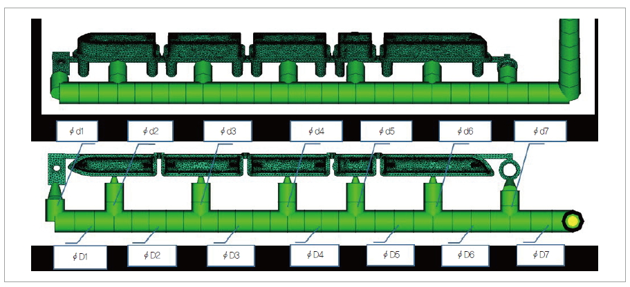 그림 1은 ‘일자’형 러너 레이아웃이며, 성형품은 7개로 구성된 것으로 Shot당 28개의 제품이 성형되도록 설계됐다.