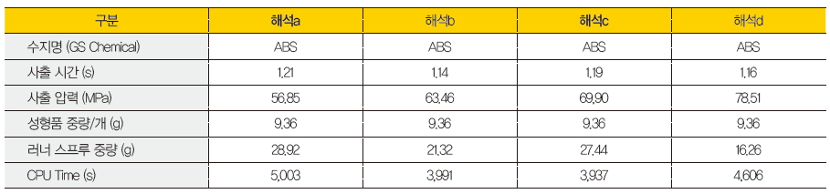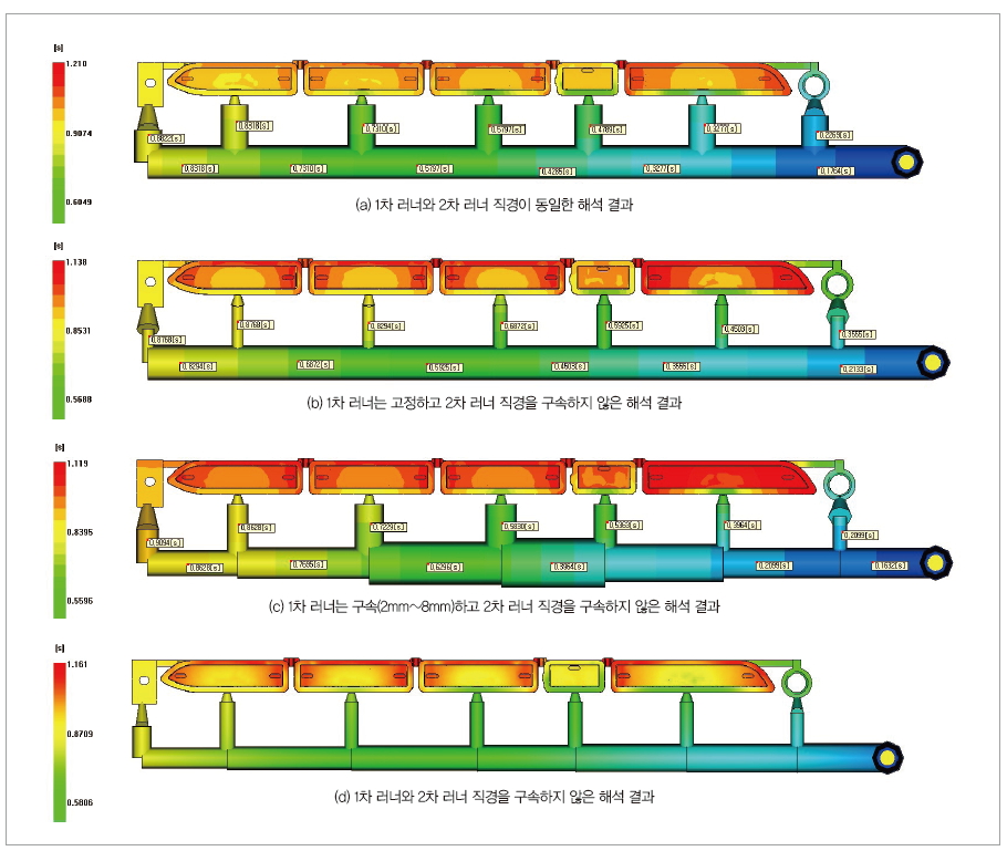 (d)는 1차 러너와 2차 러너 직경을 구속하지 않고 주어진 압력에 따라 러너의 치수를 자동으로 계산하도록 해석했다. 러너 스프루 중량은 해석 (a)보다 약 44%를 줄일 수 있었다. 사출 압력과 속도는 먼 곳인 경우 압력이 낮아지고 속도는 빨라지는 연속방정식을 따르고 있다. 해석 (d)의 사례는 러너 레이아웃으로 설계할 경우 가장 이상적인 러너 밸런스 결과를 얻을 수 있으나 기계가공 등 현실적인 어려움이 있을 것이다.