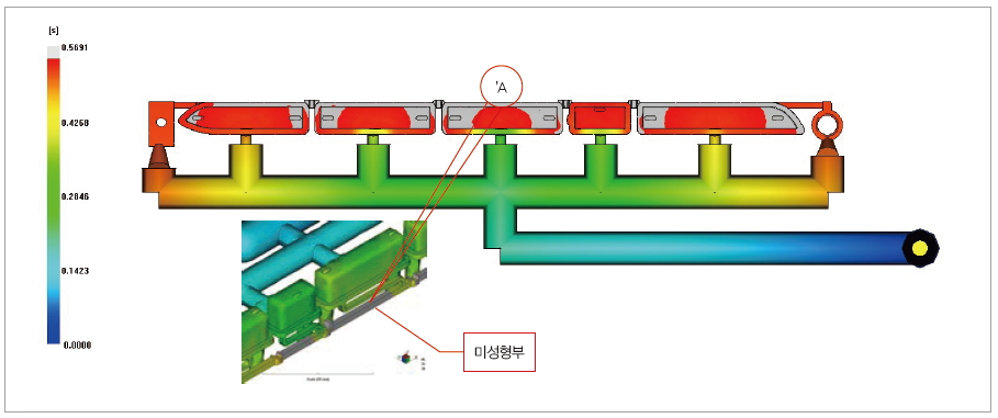 그림 3은 다년간 금형 설계 경험을 가진 전문가가 설계한 오리지널 금형 레이아웃이다. 물론 금형 제작을 완료하여 생산했던 제품이다. 계속되는 생산 제품의 트러블로 인해 러너의 중요성을 공감하기 위해 본 제품을 사례로 공유하고자 한다. Fine Element는 Dual Mesh와 3D Mesh의 두 가지 타입으로 검증했다. Dual Mesh는 66,584 Elements이고, 3D Mesh는 987,399 Elements이다. 여러 형태의 러너 레이아웃을 전사모사로 분석한 진단 결과는 오리지널 금형 레이아웃은 근본적으로 수정해야 한다는 것이다. 당초 설계된 레이아웃은 미성형부가 발생하여 주된 불량 원인이 되고 있다. 이른바 1차 러너와 ‘A’ 부위가 직접 연결되어 있다 할지라도 용융 수지는 결코 가운데부터 먼저 채워지지 않는다는 사실을 간과한 대표적인 레이아웃 설계이다. 이것은 설계자에게 제공되는 중요한 팁이 될 수 있다. 지금 당장은 금형을 재제작 할 수 없는 형편이라 성형 조건을 개선하여 보압 시간을 0.5초 늘리고, 전체 사이클 타임을 당초 50초에서 35초로 단축하여 생산은 중단하지 않고 진행했던 사례이다.
