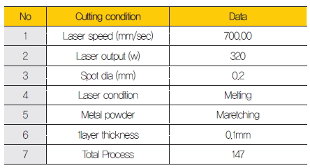 표 1의 1항에서 5항까지는 고체 분말 제조업체에 의해 정해진 조건이다. 먼저 소결가공은 Layer-to-Layer 방식으로 진행됐으며, 10Layer를 1Process 단위로 NC 가공이 진행됐다. lLayer에 약 7~8분 정도 소요됐다.