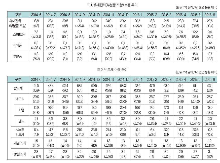 올해 1분기에는 부분품을 포함한 휴대전화 수출이 약간 주춤했지만, 국내 기업의 전략 스마트폰(갤럭시 S6, G4)과 모바일 프로세서(AP) 등의 부분품 수출 호조에 의해 2개월 연속 두 자릿수 성장세(19.4% 증가)를 기록함에 따라 2분기를 기점으로 증가세 회복이 예상되고 있다.