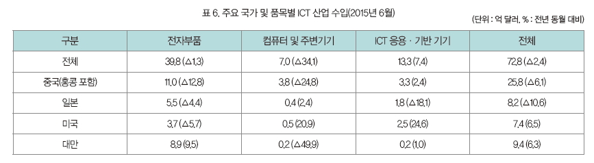 시장 조사 기관인 가트너에 따르면, 2015년 전 세계 ICT 시장은 1.3% 정도 하락할 것이라고 한다. 이와 같이 ICT 시장이 축소되고, 교역 여건이 악화됨에 따라 올해 상반기 ICT 시장은 반도체, 휴대전화를 제외하고 대부분 수출 하락세를 나타냈다. 그러나 5월 들어 2.0%, 6월 0.2% 수출이 증가하면서 2개월 연속 무역 수지 흑자 달성에 기여했다.