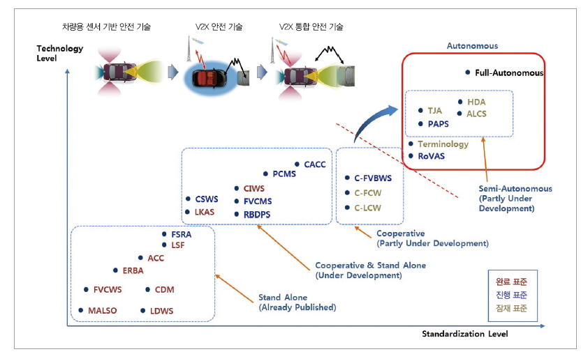 그림 3은 현재의 표준화 추진 현황을 나타낸 것이다. ACC 및 LKAS 등 전통적인 ADAS 시스템 표준은 거의 완료 단계이며 PCMS, RBDPS, CACC, C-FVBWS 등 신규 시스템 표준을 중심으로 활발한 표준 제정 활동이 진행되고 있다. 전체적으로 협조(Cooperative) 시스템 표준을 중심으로 표준화 활동이 추진되고 있다.