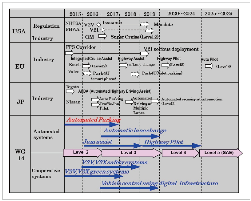 각 나라의 자율주행 자동차 개발과 WG14의 표준화 추진 로드맵은 그림 4와 같다.