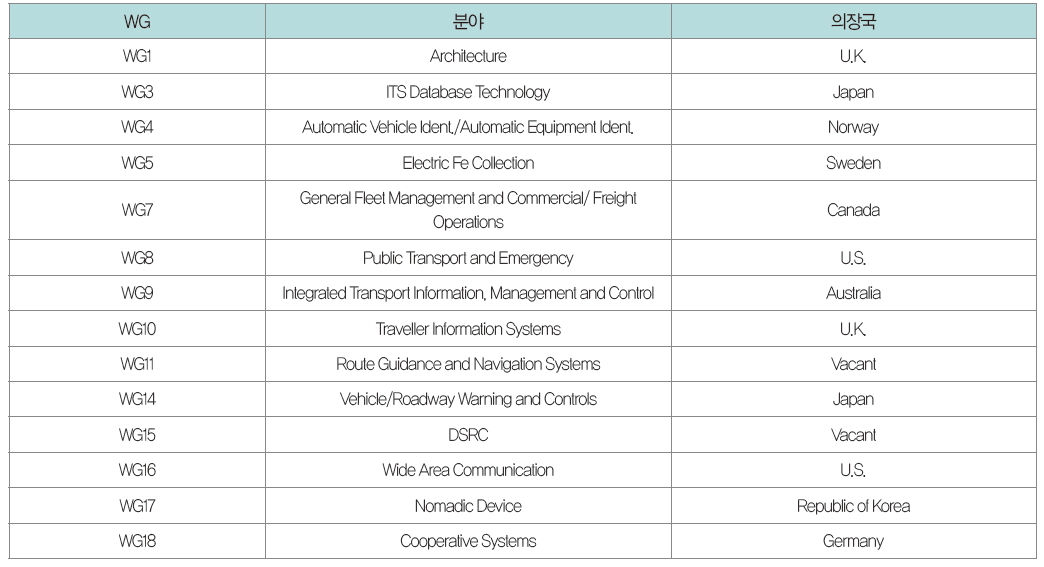 ISO TC204는 ITS를 담당하는 TC로, 1992년에 설립되어 1993년에 활동을 시작했다. 현재 다른 TC와 달리 SC(Sub-Committee) 없이 WG만으로 운영되며, WG1부터 WG18까지로 구성돼 있다. 현재 활동 중인 분과 구성은 표 2와 같다.