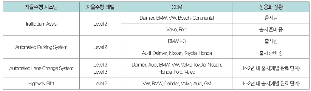 이와 같이 4종류의 자율주행 시스템 상용화 현황은 표 1과 같다. 표에 나타난 바와 같이 TJA와 APS는 이미 출시됐으며, 국내에서도 자동 주차에 대해서는 이미 2015년 서울모터쇼 등에서 상용화 수준의 제품을 선보인 바 있다. 또한 현대자동차는 2016년 제네시스에 TJA를 탑재해 판매할 계획을 공표했다.