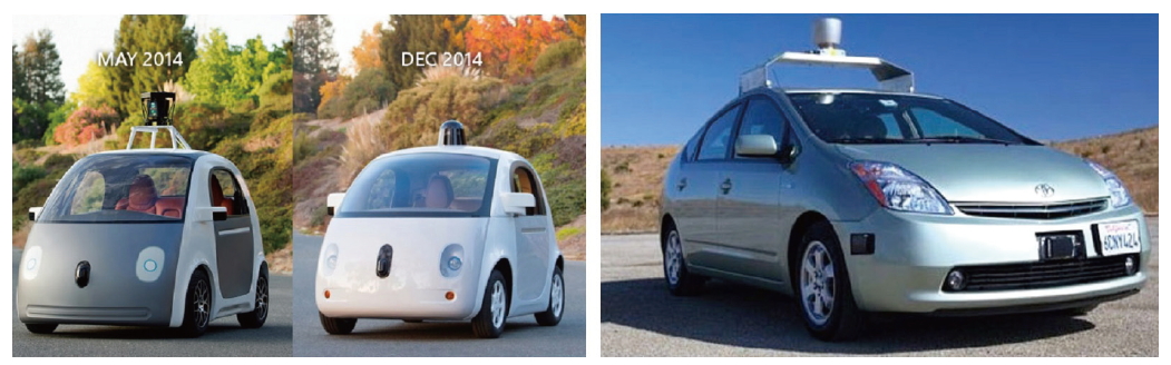그림 2. 구글의 자율주행 자동차와 프리우스 기반의 구글카 (출처 : 구글 보도자료)