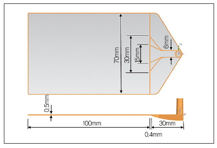 그림 1은 게이트 단면이 일직선으로 되어 있는 엣지 게이트 형상으로 두께 0.5mm를 기준으로 게이트 폭이 각각 70mm, 30mm, 15mm이고, 도광판 성형품의 길이는 100mm, 러너부는 30mm로 구분하여 3D 모델을 설계했다. 70mm 폭은 스프루에서부터 완만한 기울기로 게이트 형상을 유지하도록 설계했으며, 기울기가 끝나는 가장자리에서 게이트까지는 5mm의 균일 유동이 일어나도록 했다.