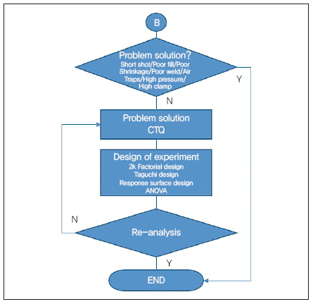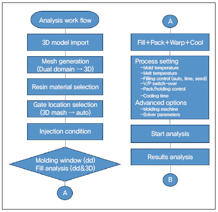 유동 해석은 플라스틱 수지의 금형 내에서의 온도, 속도, 압력의 계산을 통해 수지의 충전 패턴, 사출압력, 유동 선단 온도, 고화 시간, 웰드라인, 형체력, 수축률 등의 정보를 제공하고 있다. 또한 용융 수지의 유동과 열에 의해 유도된 잔류응력을 계산해, 변형 해석의 입력 값으로 제공한다. 이번 전산 모사 해석 절차는 그림 3과 같으며, 그림 4는 최적화 절차로 이를 기준으로 결과를 얻게 된다.