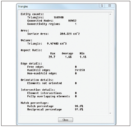 메시 생성이 완료되면 반듯이 확인해야 하는 과정이 있다. 그것은 Mesh statistics 현황이다. 여기서는 메시의 크기는 적절한가, 불량 메시의 수는 많지 않은가 등을 먼저 확인한다. 메시의 크기가 적절하지 않을 경우에는 Undo를 실행하거나 불러들이기를 통해 다시 수행한다. 생성된 메시의 불량이 수정하기 너무 많은 경우에는 여러 가지 형태의 확장자 파일을 각각 불러들여 메시 생성을 하고 비교하여 수정하기에 가장 적합한 모델을 선정한다.