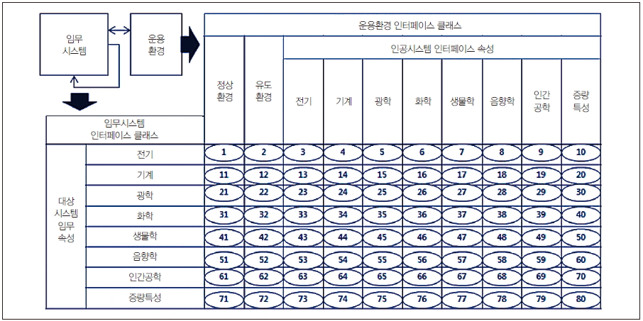 이 매트릭스는 행에 있는 임무시스템 인터페이스 클래스와 열에 있는 운용환경 인터페이스 클래스 상호간에 상호관계를 보여준다. 양 시스템 요소 도메인이 상호 비교가 되는 인터페이스 클래스를 가지고 있기 때문에 시스템 엔지니어는 각 도메인을 다양한 카테고리로 나눈다. 운용환경은 자연, 유도 및 인공시스템 요소를 포함하고 있음을 유의하도록 하라. 분석을 수행하기 위하여 우리는 행-열 상호관계에서의 고유 식별자를 사용한다.