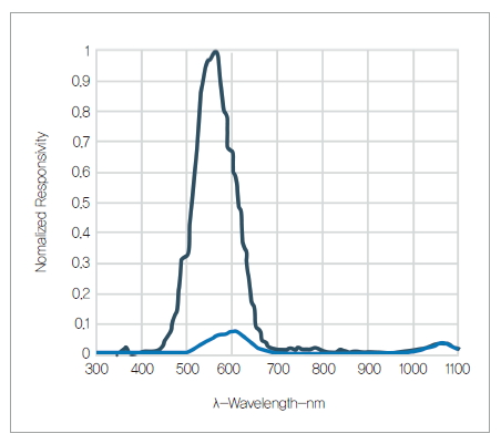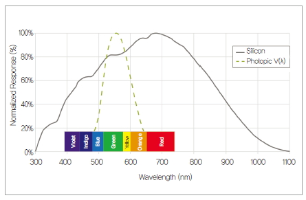 웨어러블 제품을 포함한 대부분의 가전제품에서 비용 효율성은 중요한 요소이다. 따라서 CMOS 포토다이오드로 제작된 광센서는 효율적인 솔루션일 수 있다. 그러나 CMOS 실리콘의 분광응답특성은 300nm에서 1100nm사이로 약 700nm의 적외선 영역에서 최대치에 도달한다. 그림 2에서 보듯이, 인간의 눈은 390∼750nm 파장 범위에서 빛에 반응한다. 또한 그림 3에서 나타낸 바와 같이, 인간의 눈이 빛에 반응하는 가시광선 영역은 전체 포토다이오드 반응 영역 중 작은 부분을 차지한다.