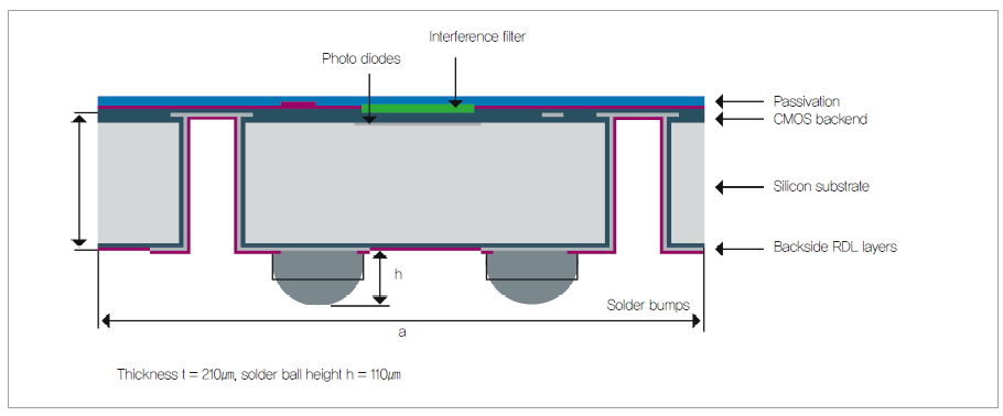 ams는 최첨단 광 센서 기술을 위해 TSV(through-silicon via) 패키징 기술을 채택했다. TSV 기술은 와이어 본드를 사용하지 않으며, 아래 그림 6에 제시된 바와 같이 디바이스 I/O에서 솔더볼까지 직접 연결시킨다.