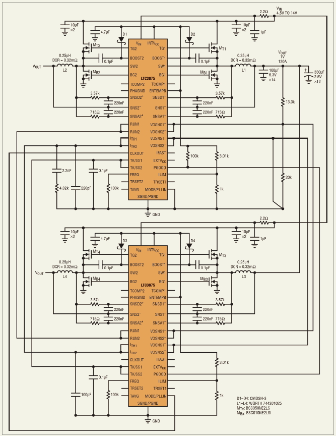 그림 5. LTC3875와 LTC3874를 사용한 단일 출력 4위상(1.0V/120A) 컨버터