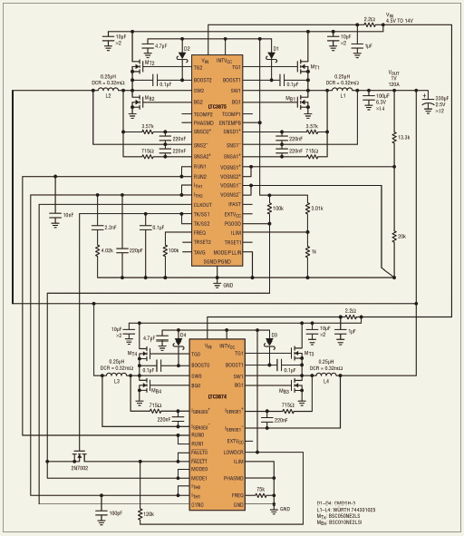그림 1은 2개 LTC3875를 사용한 4.5V∼14V 입력 단일 출력 애플리케이션을 나타낸 것이다. LTC3875 2개의 4개 채널이 90° 위상 편이로 동작함에 따라, 입력 RMS 전류 리플과 필요한 커패시터의 크기를 줄인다. 각 위상이 하나의 상단 MOSFET과 하나의 하단 MOSFET을 사용해 30A의 전력을 공급한다.