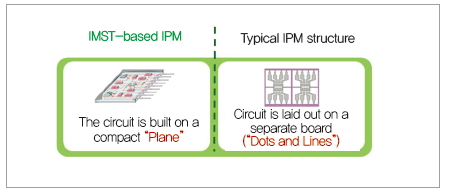 일반적인 IPM은 여러 부품들을 별도의 회로 기판에 탑재하는 것인데 그 구조는 점과 선이 상호 연결된 일종의 프레임이므로 그 프레임 내에서 여러 가지 기능을 실행할 수 없다. 그러나 IMST 구조에서는 회로가 하나의 회로 기판에 탑재되므로 여러 가지 기능이 쉽게 실행될 수 있다.